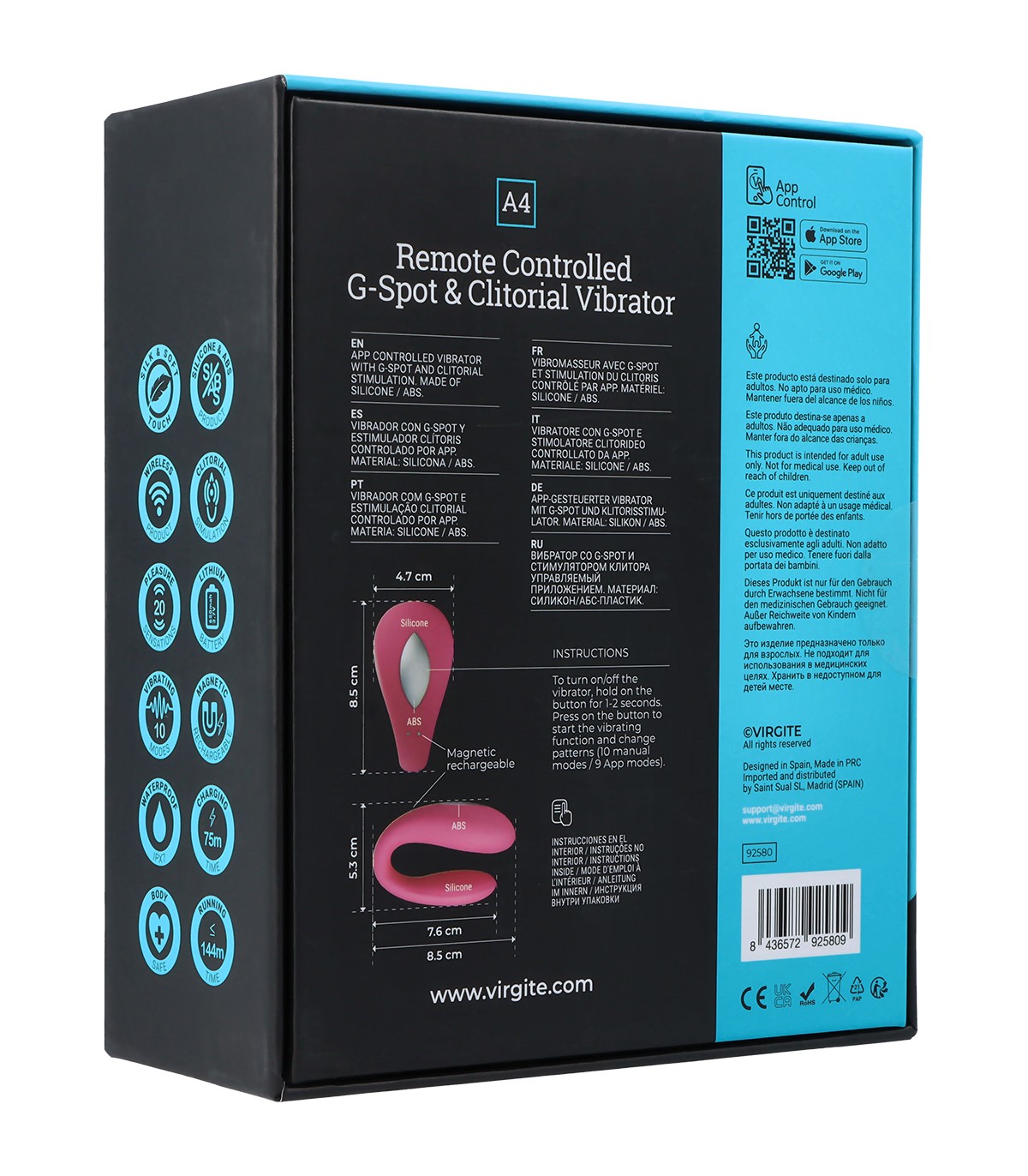 Virgite, erotyczne produkty, to zarejestrowana marka zaprojektowana w Hiszpanii i wykonana z wysokiej jakości materiałów. Obejmuje ona różne linie produktów, które będą rozszerzane, aby zaspokoić potrzeby wszystkich odbiorców. Wibrator przeznaczony zarówno do użytku solo, jak i dla par. Wyposażony jest w podwójny silnik do jednoczesnej stymulacji obojga partnerów. Wykonany z miękkiego silikonu, posiada różne prędkości i intensywności sterowane zarówno z poziomu zabawki, jak i aplikacji marki. Cechy produktu: - Wykonany z silikonu.