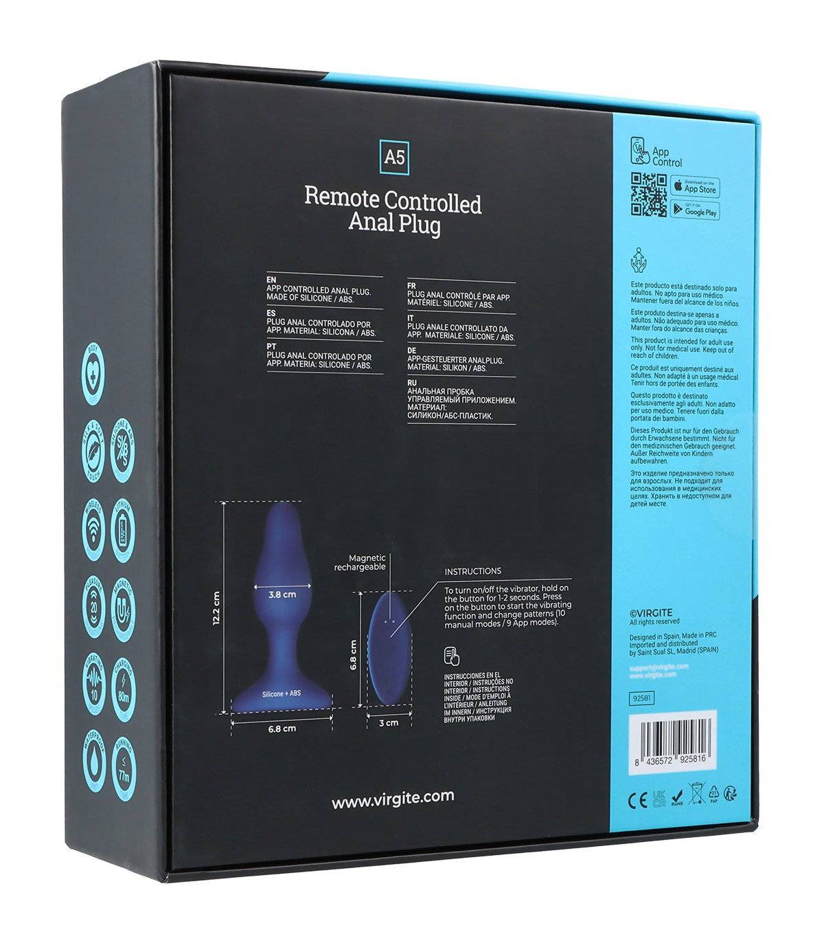 Virgite, erotyczne produkty, to zarejestrowana marka zaprojektowana w Hiszpanii i wykonana z wysokiej jakości materiałów. Obejmuje ona różne linie produktów, które będą rozszerzane, aby zaspokoić potrzeby wszystkich odbiorców. Wibrator analny wykonany z miękkiego, jedwabistego silikonu, ładowany za pomocą kabla USB. Oprócz sterowania różnymi prędkościami i intensywnością zabawki, można ją również kontrolować za pomocą aplikacji. Cechy produktu: - Wykonany z silikonu. - Ładowany za pomocą kabla magnetycznego.