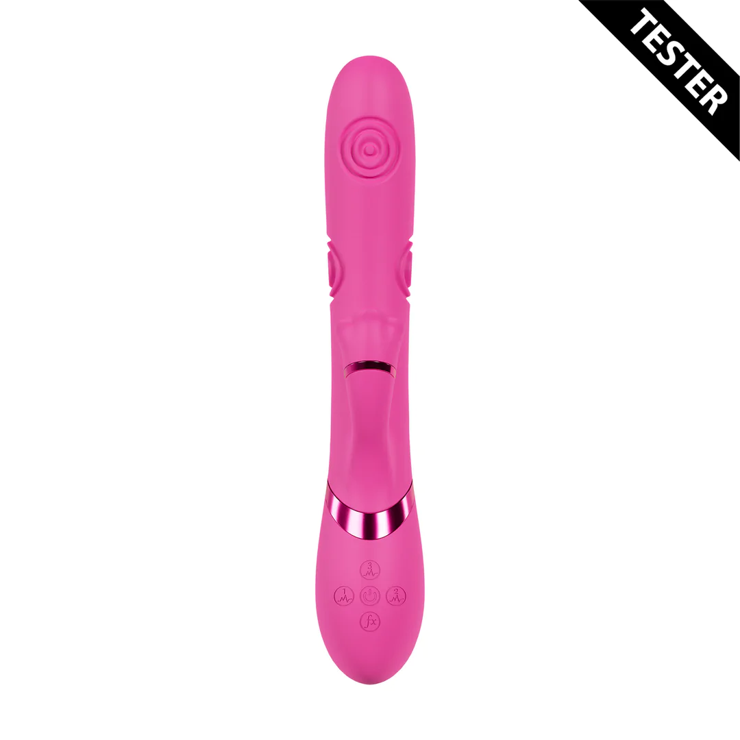 Wibrator VIVE063PNKTEST zdecydowanie wyróżnia się na tle konkurencji. Ten pięknie zaprojektowany wibrator napędzają trzy niezależnie sterowane silniki nowej generacji F1 z 10 funkcjami. Znajdziesz tu silnik z końcówką wibrującą do stymulacji punktu G, stymulator łechtaczki z funkcją ssania Air Wave oraz silnik z funkcją stymulacji pulsacyjnej, które pomogą Ci osiągnąć oszałamiającą rozkosz. Dzięki ponad 1000 różnych kombinacji ta zabawka zabierze Cię w miejsca, o których nawet nie śniłaś. Kiedy zbliżasz się do orgazmu, wystarczy jedno naciśnięcie specjalnego przycisku, aby natychmiast uruchomić wszystkie silniki z pełną mocą i prędkością. Ten w pełni ładowalny przez USB, magnetyczny wibrator z silikonu klasy medycznej może pochwalić się 90-minutową żywotnością baterii na jednym ładowaniu, co daje Ci mnóstwo czasu na odkrywanie. Wszystkie wibratory VIVE objęte są roczną gwarancją.
