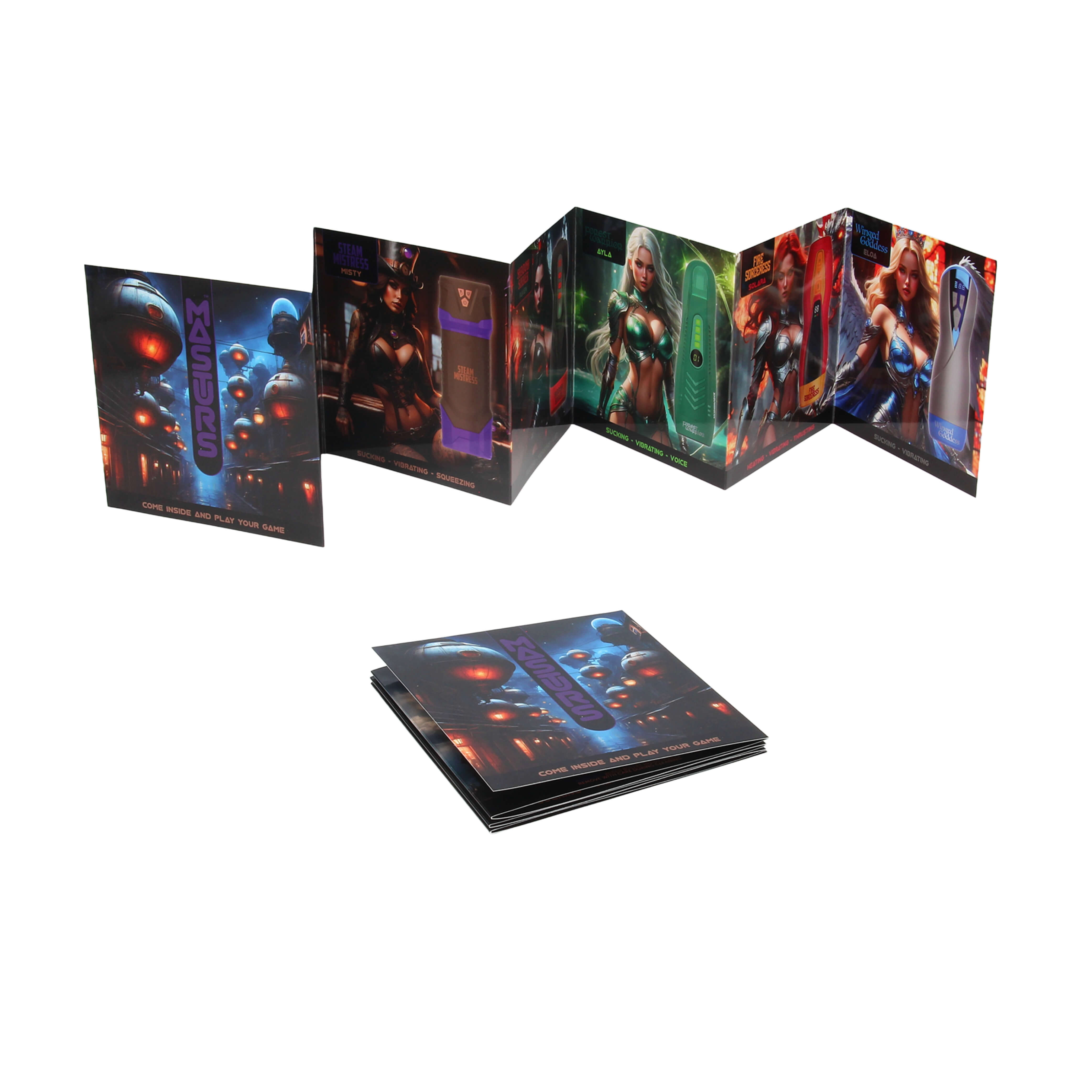 Wielofunkcyjny masturbator oferuje ssanie, wibracje oraz ściskanie, zapewniając intensywną i zróżnicowaną stymulację. Charakter Misty – zadziornej, steampunkowej Latynoski – przenika całe doświadczenie, potęgując klimat dzikiej, bezkompromisowej zabawy. Dopełnieniem jest warstwa cyfrowa: w książeczce znajdziesz kody QR i unikalny kod, które pozwalają wybrać rozszerzoną rzeczywistość (AR) lub zmysłowy film, osadzony w świecie zeppelinów, silników i niekończącej się przyjemności.Nie kupujesz tylko produktu – odblokowujesz świat. Pozwól Misty zabrać Cię na przejażdżkę do Gearford i odkryj kolejne moce Masturs.